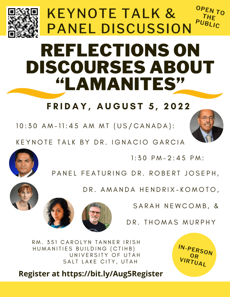 The public is invited to two public sessions of the workshop relating to “Reflections on the Discourses about ‘Lamanites'” on Friday, August 5, 2022 in room 351 of the Carolyn Tanner Irish Humanities Building (CTIHB) at the University of Utah in Salt Lake City, Utah [please note that in-person attendees will be responsible for their own parking costs but free lunch will be offered at the venue]: