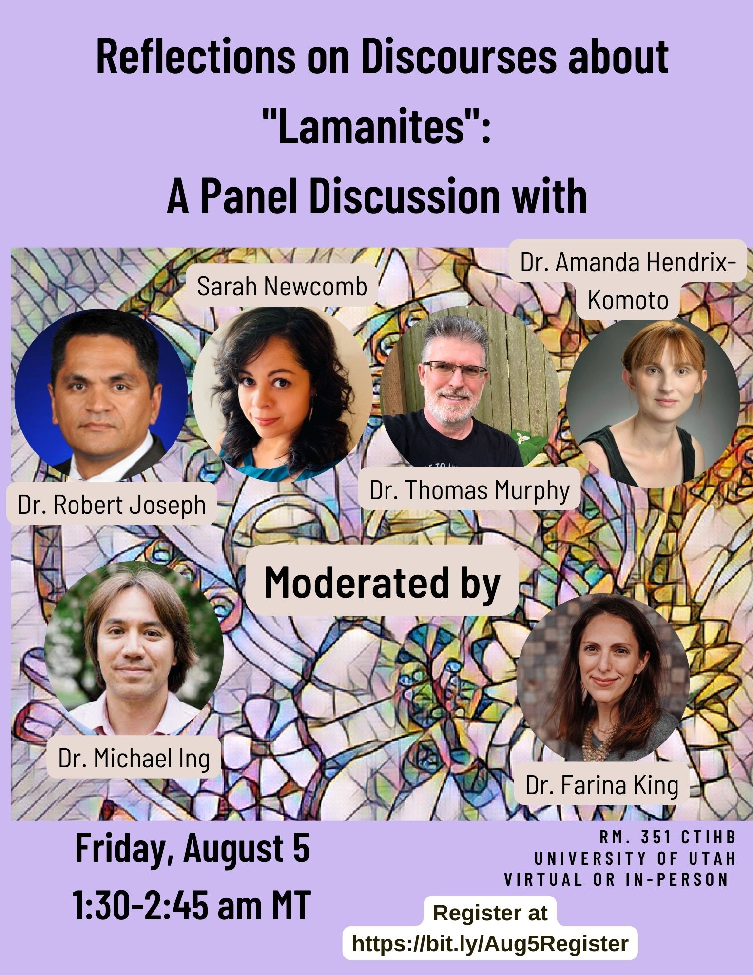 The public is invited to two public sessions of the workshop relating to “Reflections on the Discourses about ‘Lamanites'” on Friday, August 5, 2022 in room 351 of the Carolyn Tanner Irish Humanities Building (CTIHB) at the University of Utah in Salt Lake City, Utah [please note that in-person attendees will be responsible for their own parking costs but free lunch will be offered at the venue]: