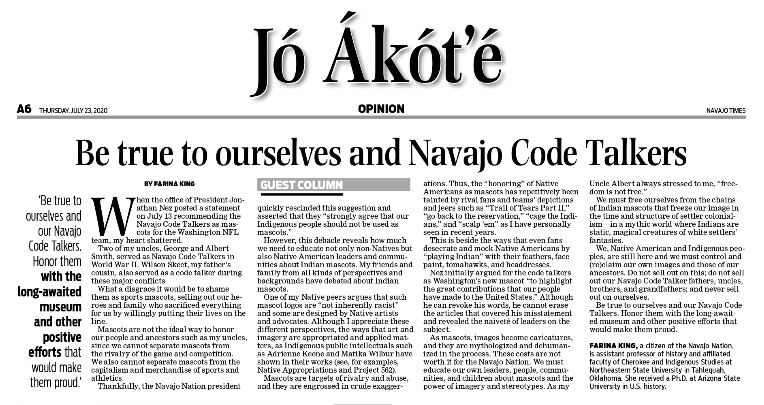 “Be true to ourselves and Navajo Code Talkers,” Navajo Times, July 23, 2020.