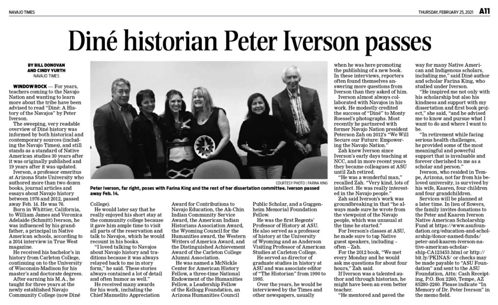 Diné historian Peter Iverson passes, The Navajo Times, February 25, 2021.