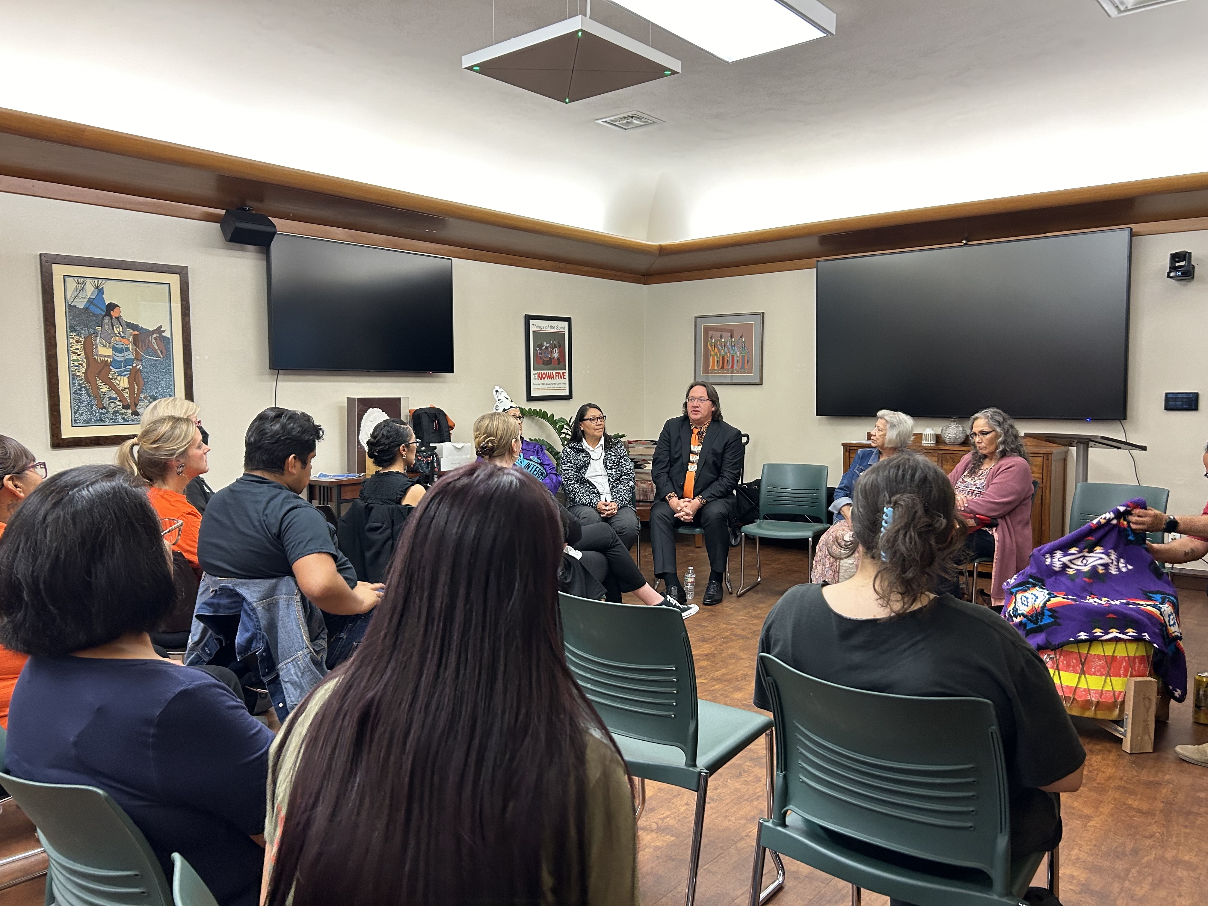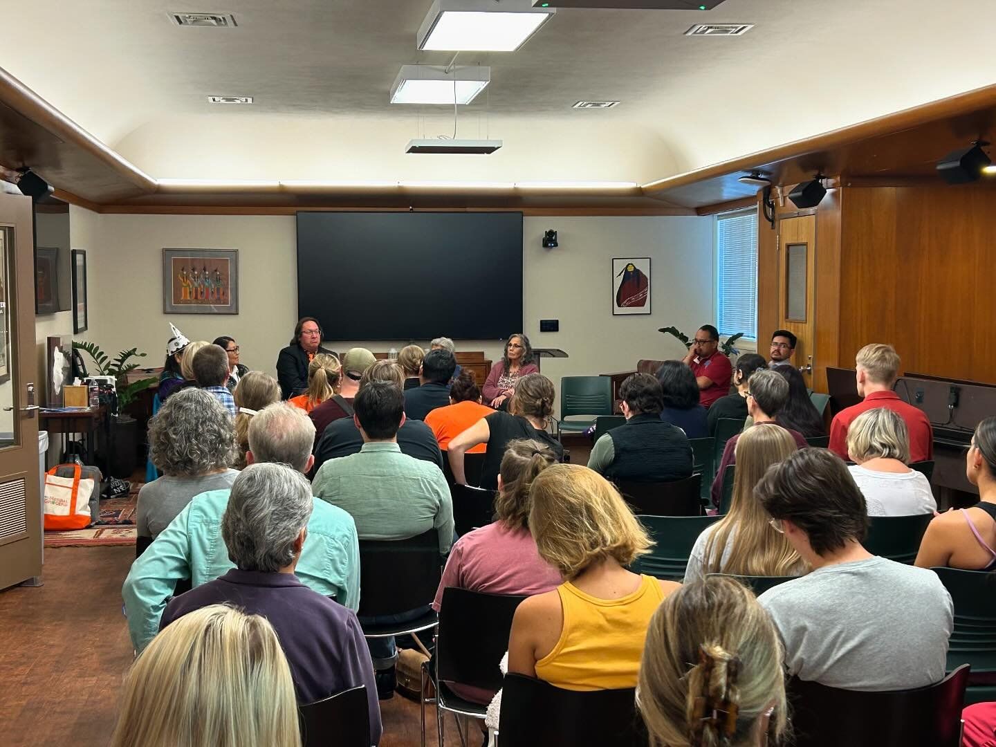 Our team held a preliminary workshop, from September 30 to October 1, 2024, in the Native Nations Center event room on the OU-Norman campus to review and set our objectives and goals, planning for our next steps and processes. The panel was the only public session of the workshop, which featured Chief Benjamin Barnes of the Shawnee Tribe. The Norman Transcript article (by Zack Wright) highlights most of the panel, which also included NAS Mellon postdoctoral fellow Dr. Kelly Berry, Intermountain Indian School alumni Lorina Antonio and Gay Dawn Pinnecoose, and Chilocco Indian School alumni organization leaders Pamela Hurt (historian), and Carole Fife Stewart with songs shared by Oliver Plumley (Otoe/Comanche/Lakota) and Dr. Max Yamane.