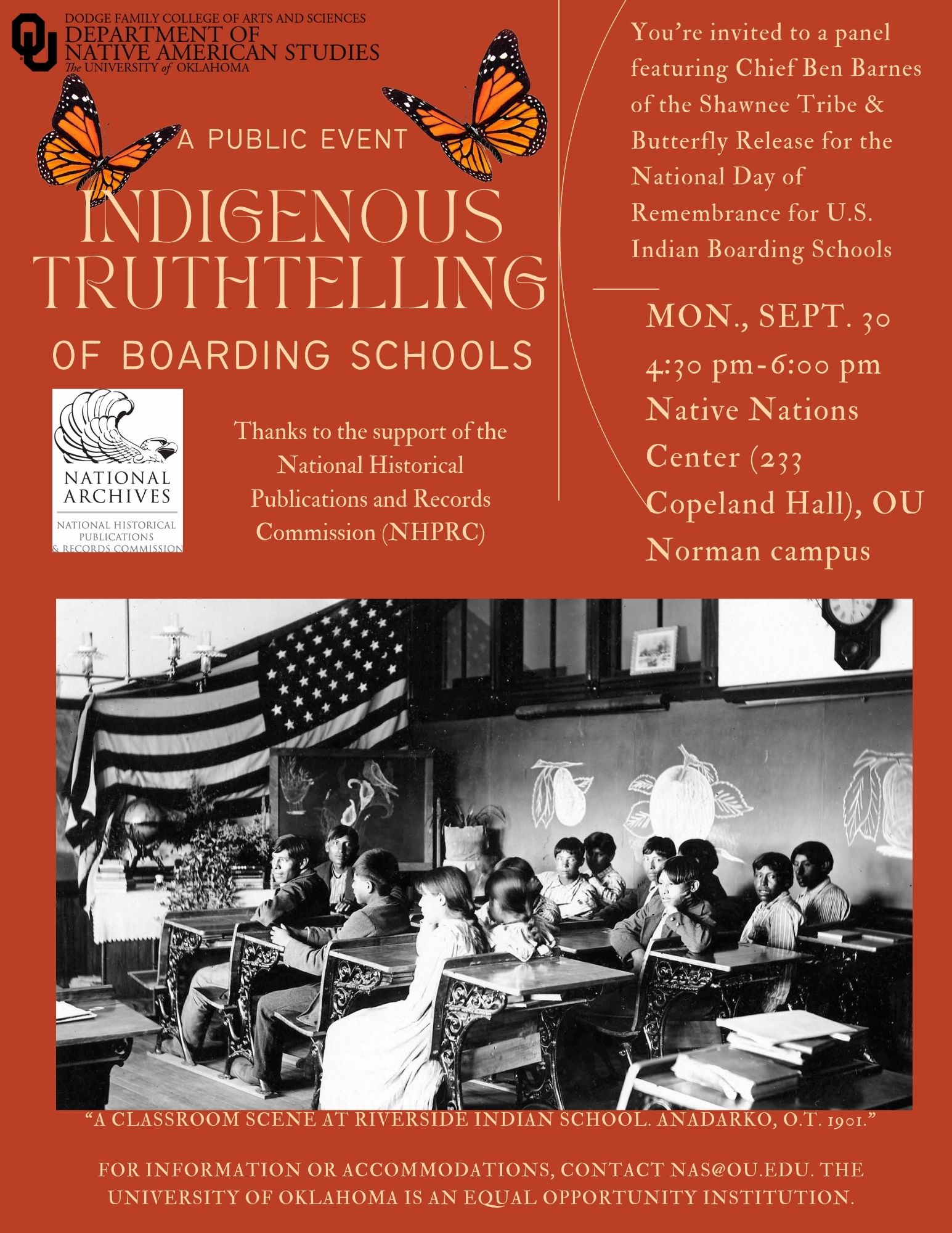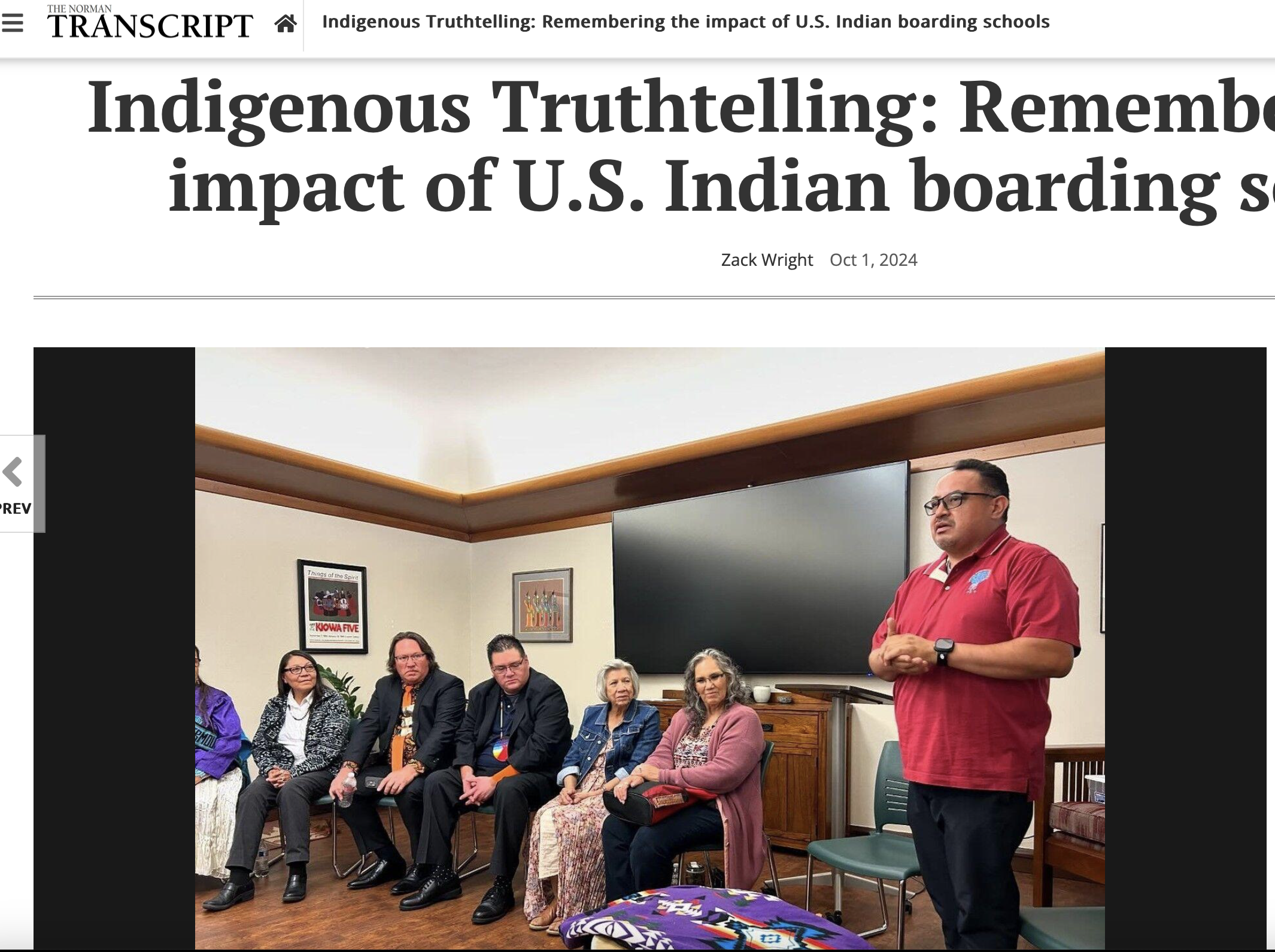 As a part of an initiative for Indigenous Truthtelling of Boarding Schools, I helped to organize a public panel and event on September 30, 2024, for the National Day of Remembrance of U.S. Indian Boarding Schools, which The Norman Transcript covered in the article, “Indigenous Truthtelling: Remembering the impact of U.S. Indian Boarding Schools” (written by Zack Wright, posted on October 1, 2024). For a planning grant, between 2024 and 2026, I am working with librarian Lina Ortega (Sac and Fox), Dr. Bonnie Pitblado, Dr. Chengbin Deng, Cheyenne Widdecke, Dr. Nina Bledsoe, and Dr. Belinda Biscoe and others at the University of Oklahoma (OU) along with several universities and communities in Oklahoma and Utah for the project, Indigenous Truthtelling of Boarding Schools. The project received $120,000 funding through the NHPRC-Mellon Planning Grants for Collaborative Digital Editions in African American, Asian American, Hispanic American, and Native American History and Ethnic Studies, beginning in 2024. This grant announcement was highlighted in the article, “Two OU-Led Digital Projects Receive National Archives Funding.”